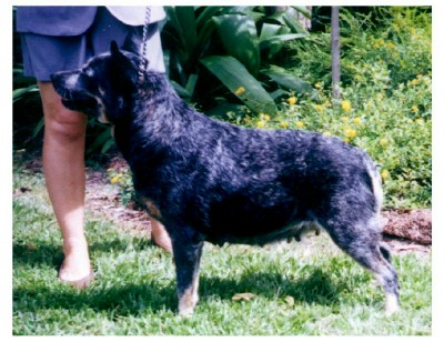 | Our Bella (beautiful) BELLA. Classic type, strong head and superb topline. All of these qualities live on in her carbon-copy daughter Phoebe. Bella is also the dam of our exceptional Elmo. Bella was awarded AUST. BERD IN SHOW at the ACD club of Victoria spacialty in 2000 Now retired and living a spoilt life not far down the road from TAGETARL. |