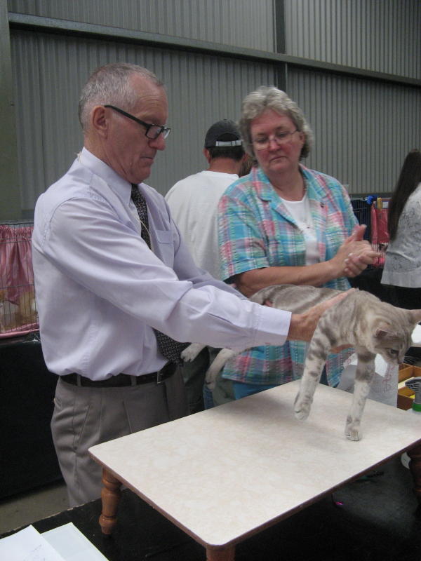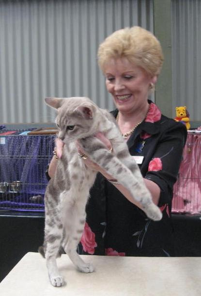| Hi Carol, I just wanted to let you know that I entered both my kittens in their first show and that 'Mr Marbles' (as we have decided to call him), did quite well. There were four shows and Marble won BEST KITTEN in one ring; R/UP BEST KITTEN in two shows and fourth BEST KITTEN at the final show. He received BEST OF BREED in each ring. The judges were commenting on his beautiful marbleing; nice width between the ears, his eye colour, misting and robust body. One judge was particularly impressed with his slightly rounded ear shape. Anyway, I hope this is positive feedback for you. Another Mist breeder down here also thought he was quite a good looking cat. Thank you for agreeing to sell him to me... I wouldn't want another cat - he has such a wonderful temperament. The day after he arrived, we discovered he loves to play fetch! He is quite a dog - cat :) |